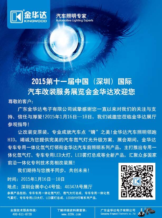 讓改裝變原裝,專業成就愛車點睛之美!金華達汽車照明領跑HID,竭誠為您提供完美汽車氙氣燈改裝升級方案,主營專車專用一體化氙氣燈、氙氣燈大燈總成、LED專用日行燈系列,全新系列專車專用LED大燈、LED霧燈總成等新產品將于2015年1月1618日亮相第十一屆中國深圳(國際)國際汽車改裝服務展覽會,深圳會展中心4號館:40347A號展廳,萬分期待您的蒞臨!