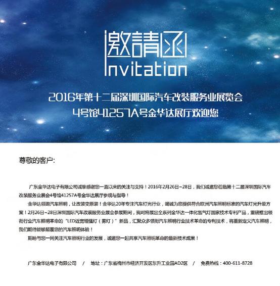 廣東金華達電子有限公司誠摯感謝您一直以來對我們的支持與厚愛!2016年2月26日~28日,誠邀您蒞臨第十二屆深圳國際汽車改裝服務業展覽會4號館41257A金華達展廳參觀指導!