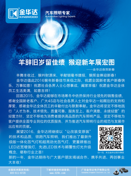 展望2016,金華達(dá)將繼續(xù)以“讓改裝變原裝”的技術(shù)和品質(zhì),領(lǐng)跑汽車照明,我們推出了最新升級版一體化氙氣燈和超亮勁光氙氣燈,更重磅推出LED近寬燈,先進(jìn)LED技術(shù)與顛覆性燈光升級概念,堪稱行業(yè)之首!